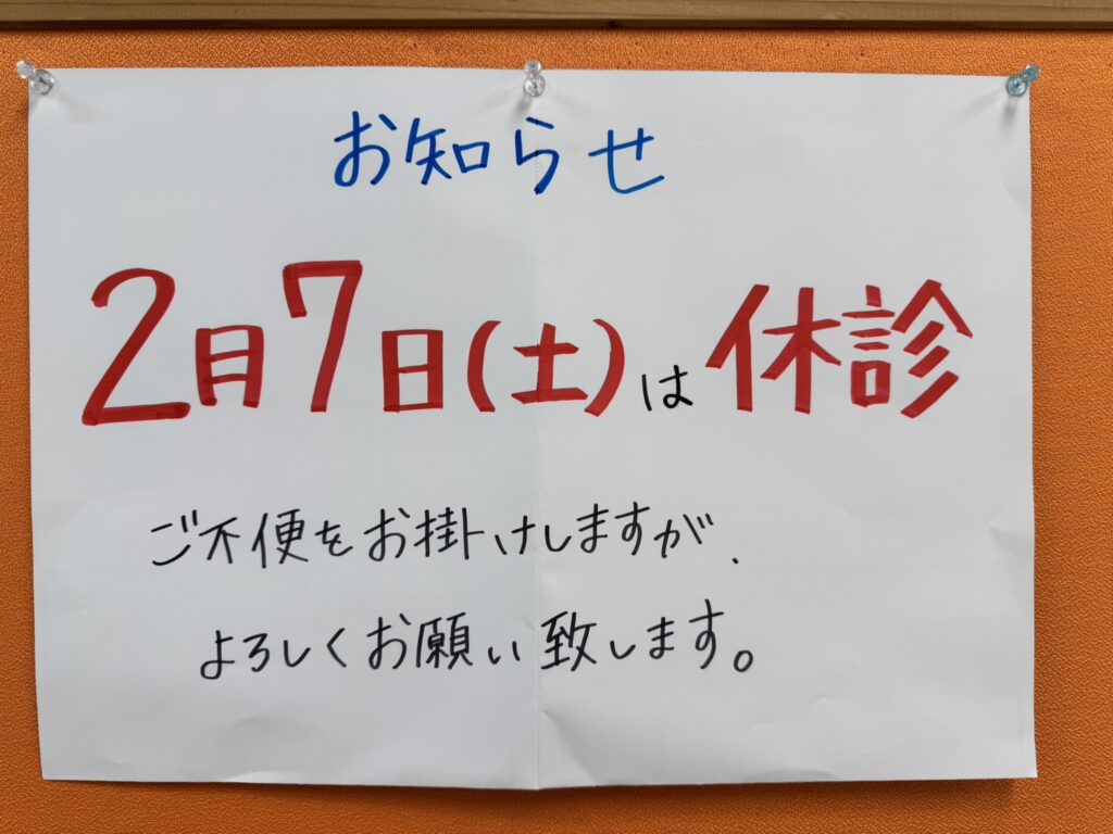 祝日は休診。他に、夏期休診、年末年始休診、臨時休診。